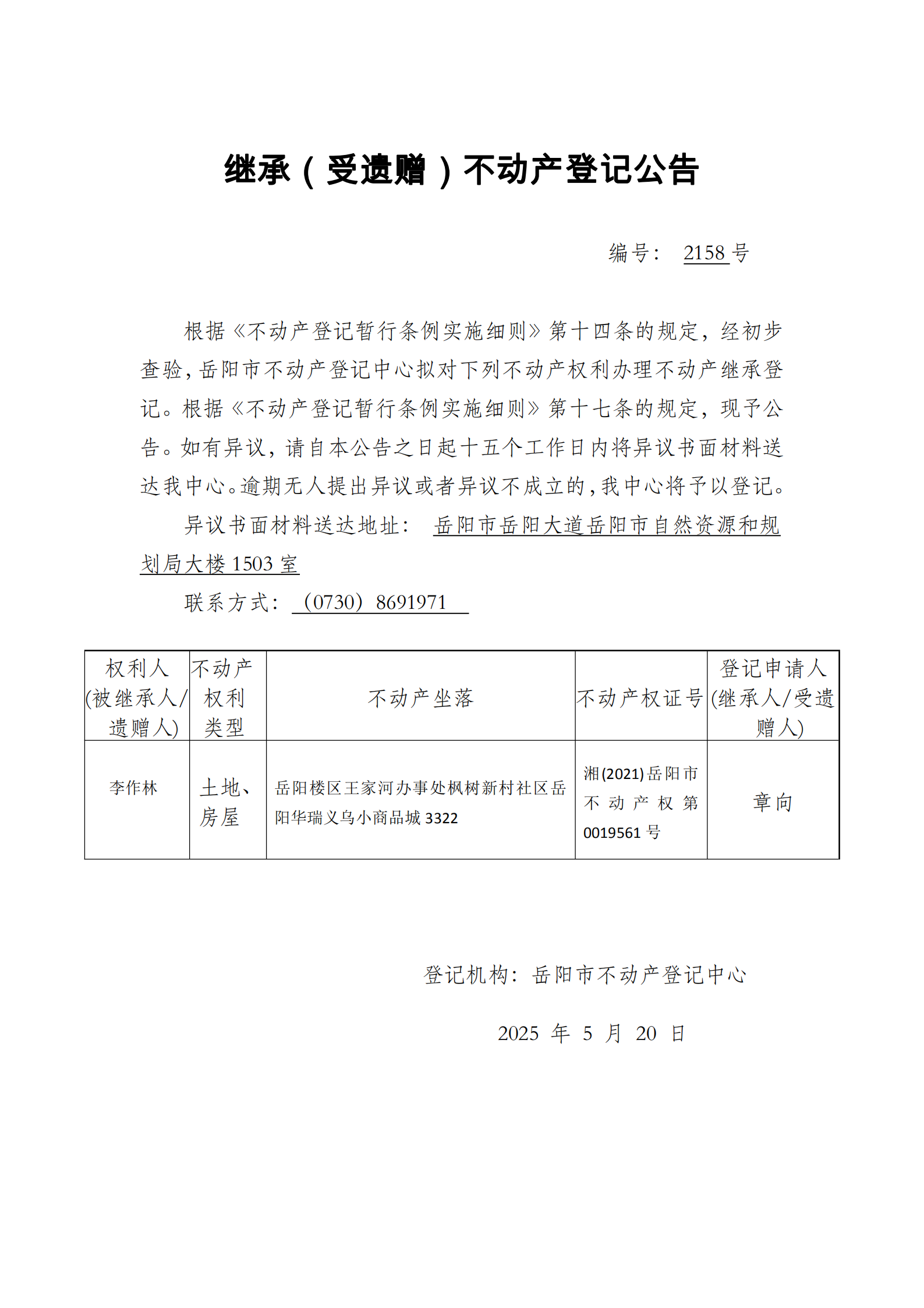 继承(受遗赠)不动产登记公告 编号:章向(2158)