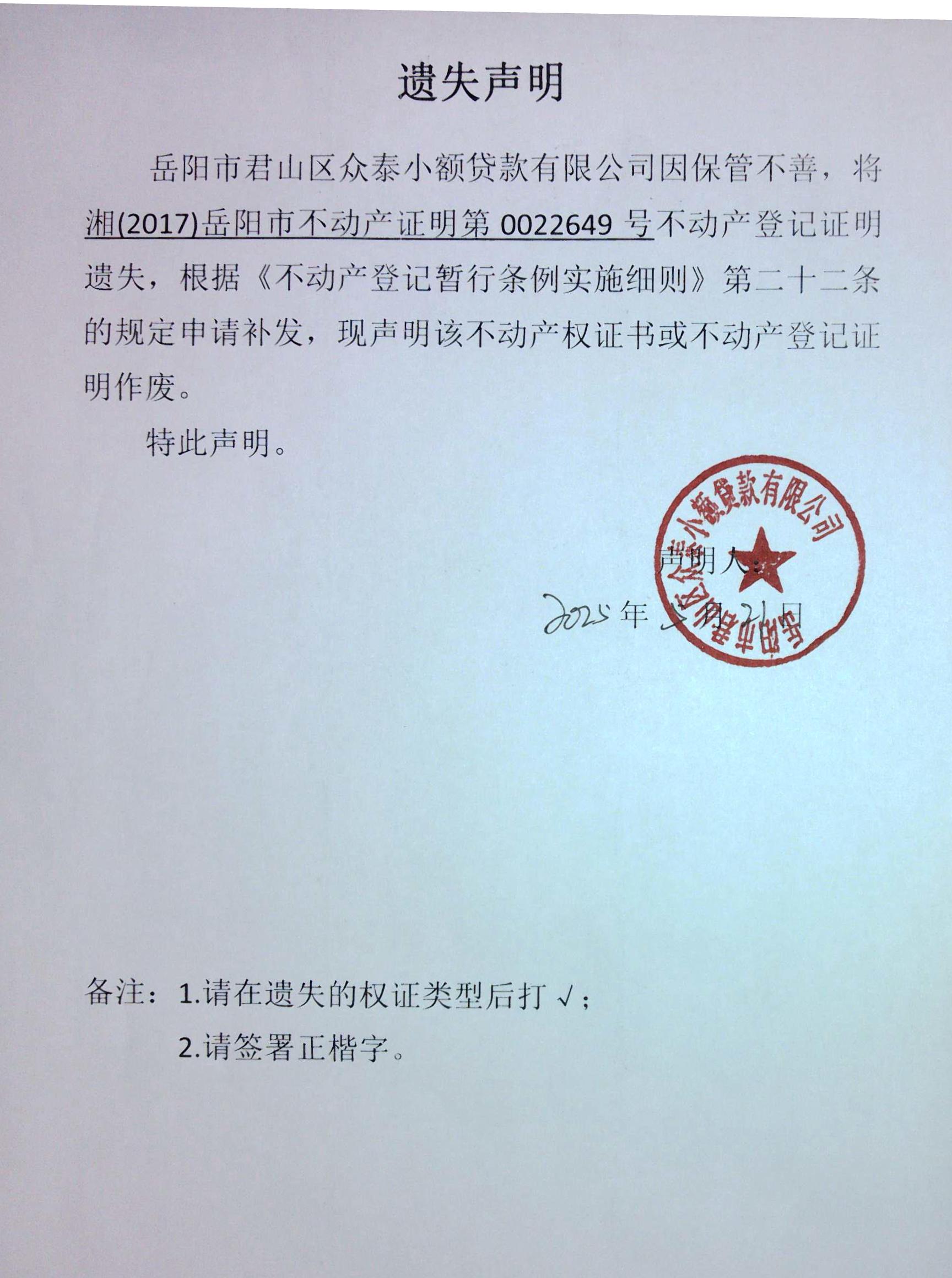 遗失声明(岳阳市君山区众泰小额贷款有限公司)
