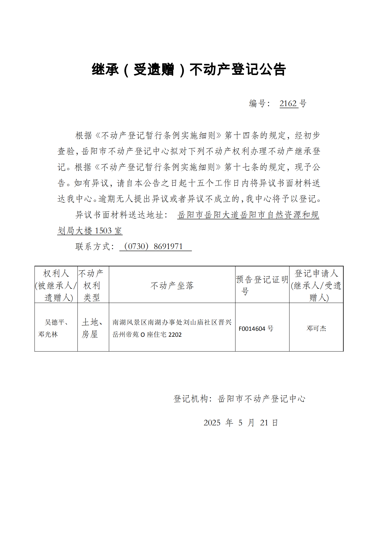 继承(受遗赠)不动产登记公告 编号:邓可杰(2162)