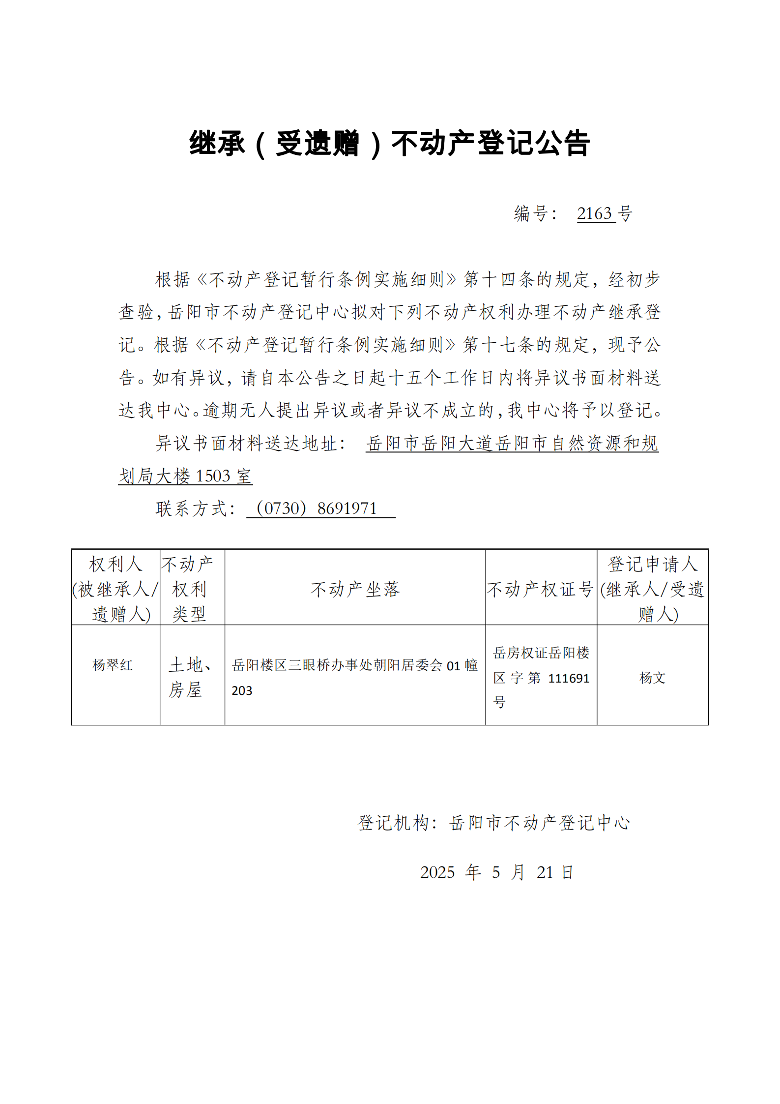 继承(受遗赠)不动产登记公告 编号:杨文(2163)