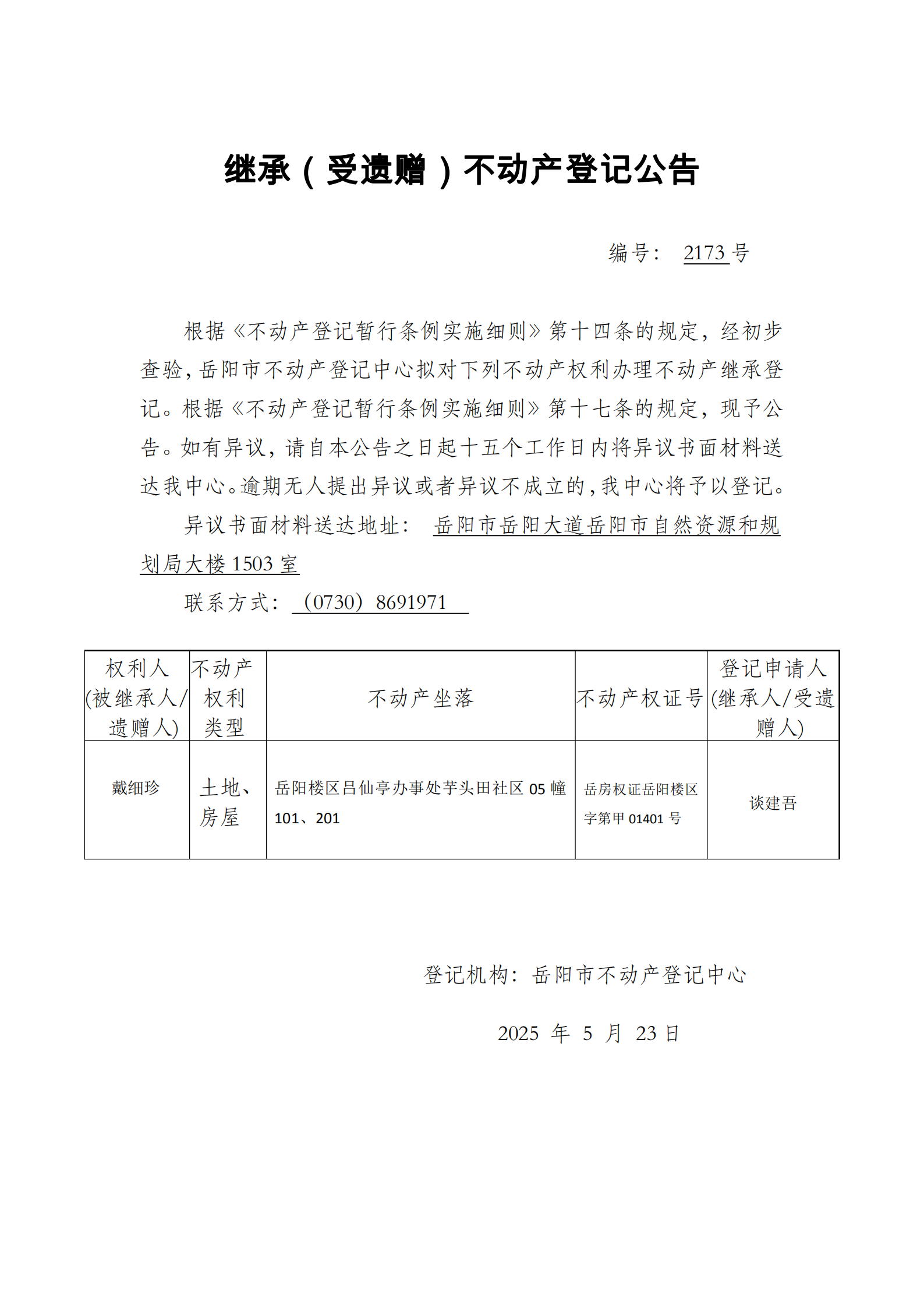 继承(受遗赠)不动产登记公告 编号:谈建吾(2173)