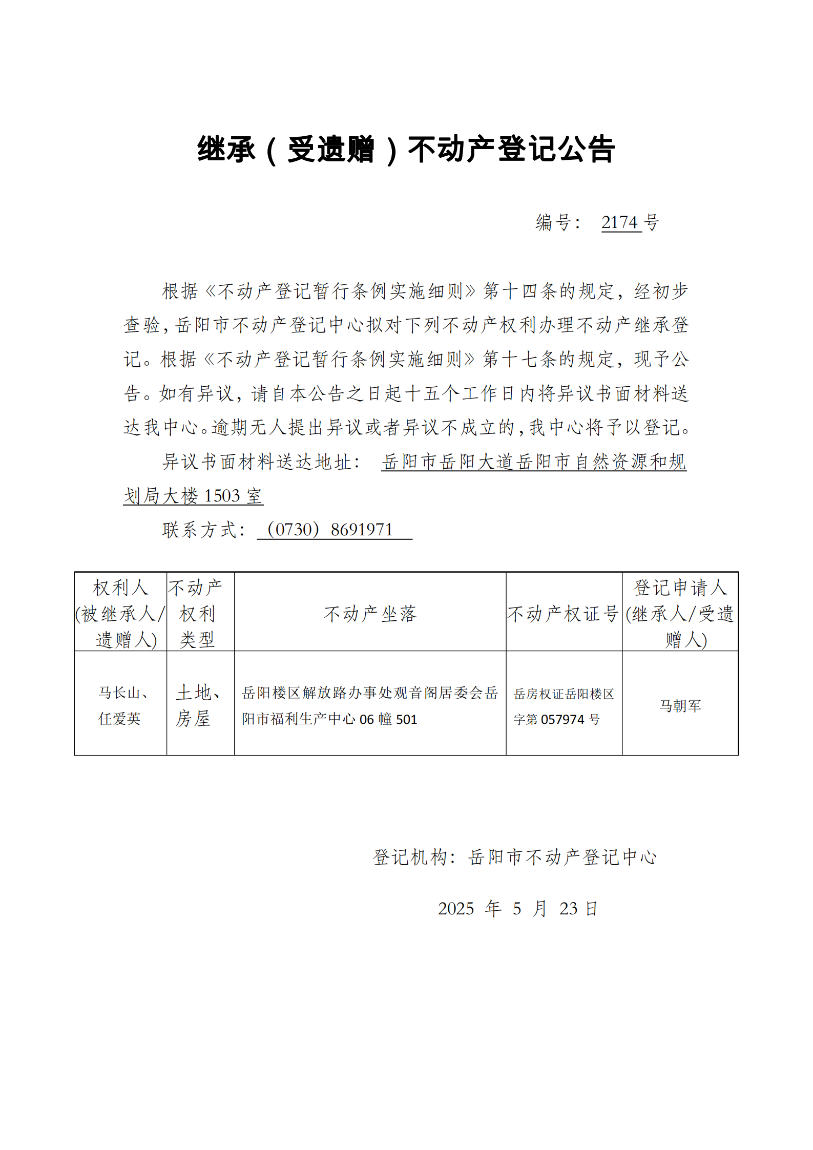 继承(受遗赠)不动产登记公告 编号:马朝军(2174)