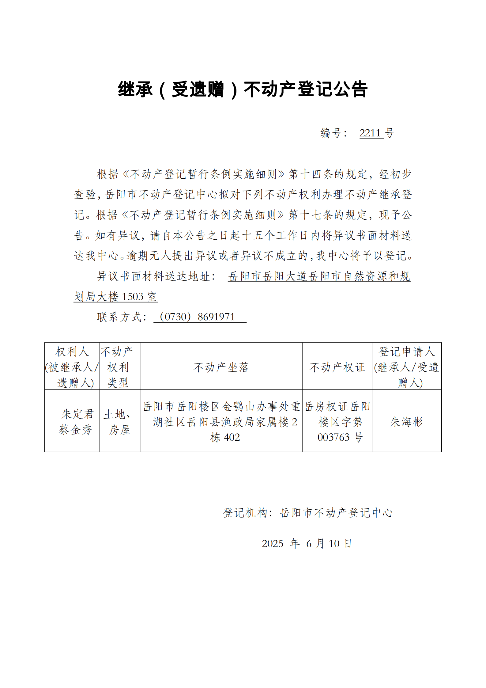 继承(受遗赠)不动产登记公告 编号:朱海彬(2211)