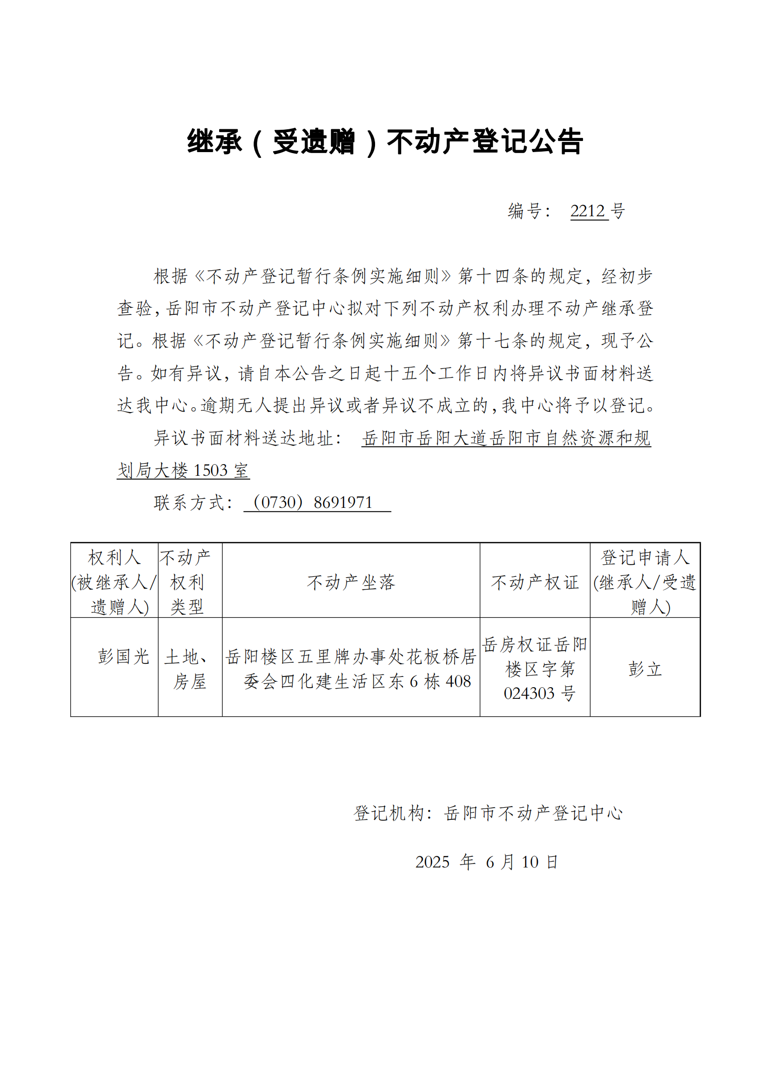 继承(受遗赠)不动产登记公告 编号:彭立(2212)