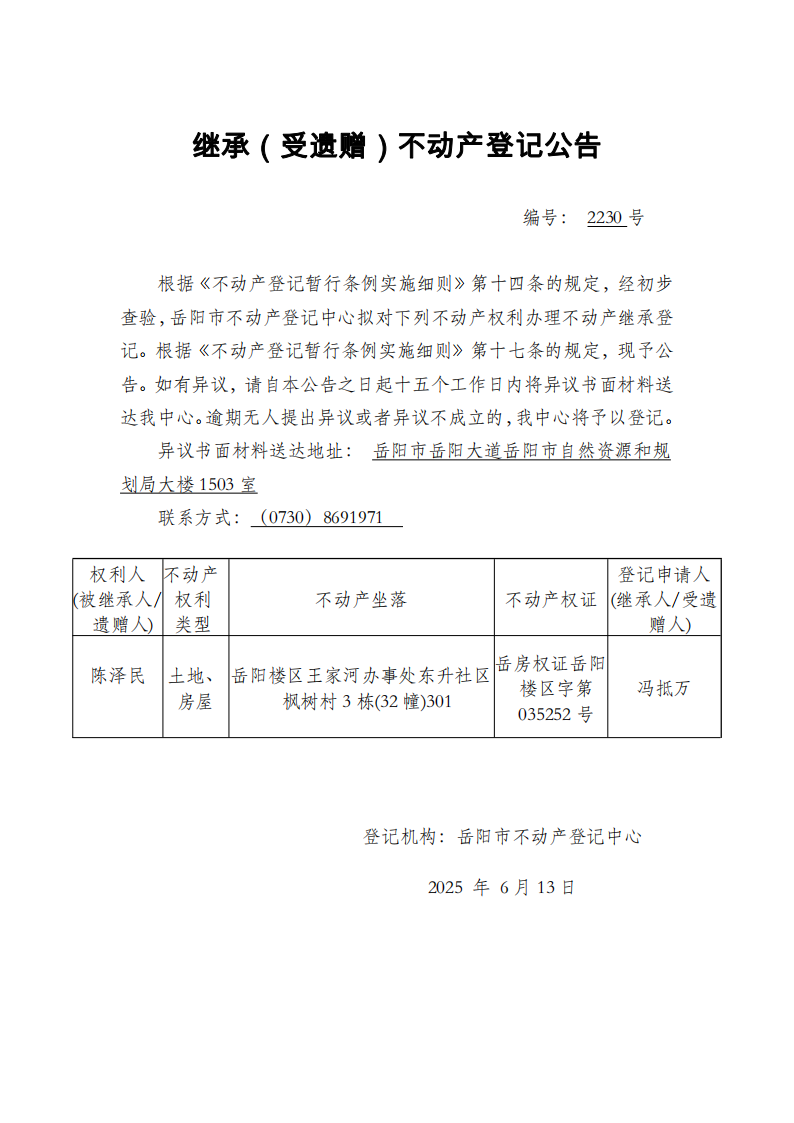 继承(受遗赠)不动产登记公告 编号:冯抵万(2230)