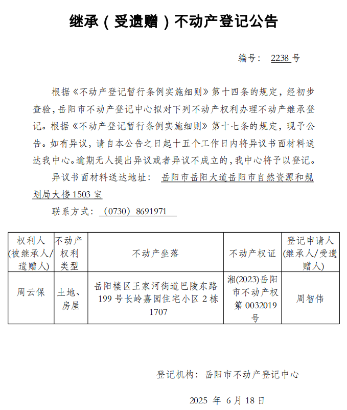 继承(受遗赠)不动产登记公告 编号:周智伟(2238)