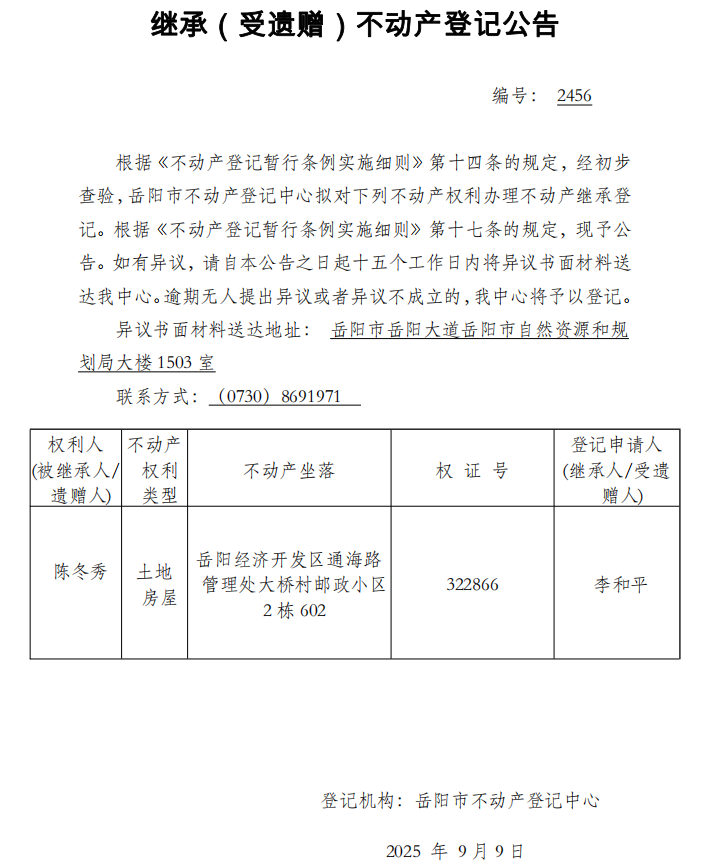 继承(受遗赠)不动产登记公告 编号:李和平(2456)