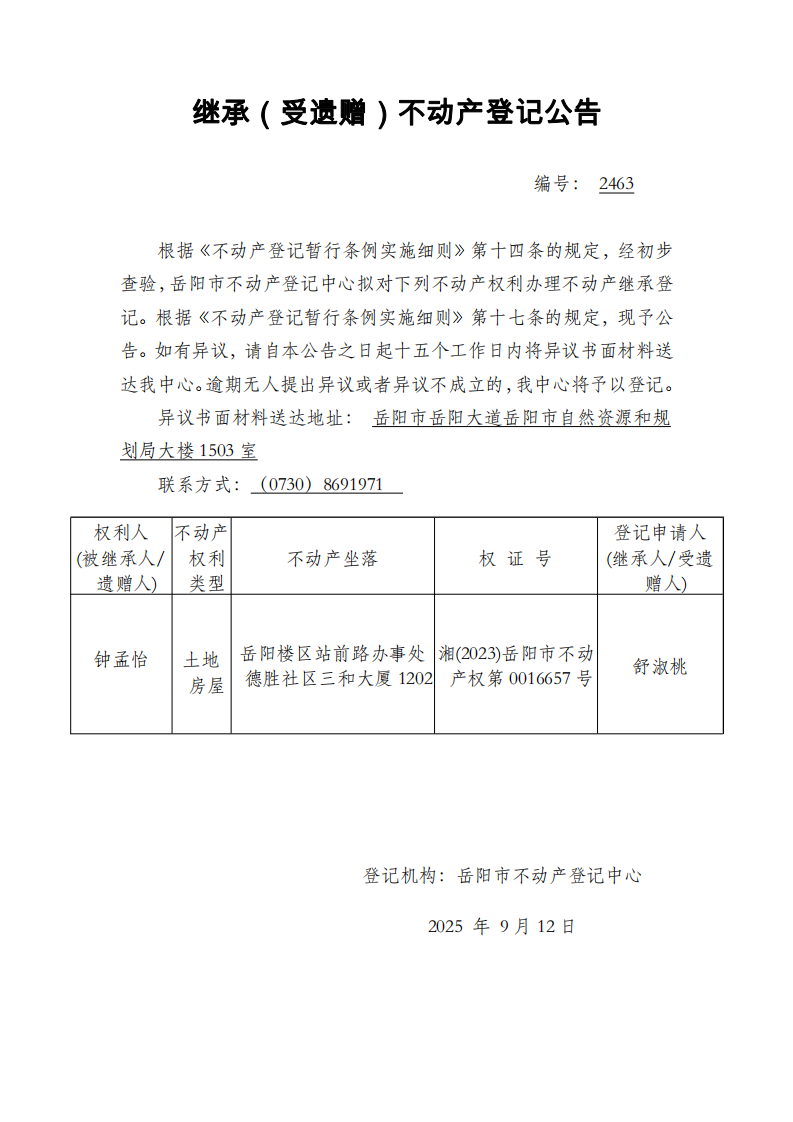 继承(受遗赠)不动产登记公告 编号:舒淑桃(2463)