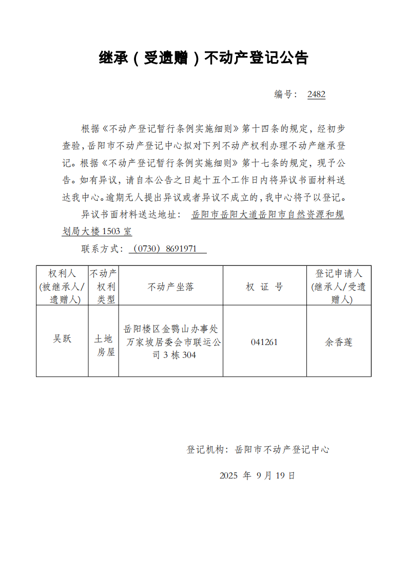 继承(受遗赠)不动产登记公告 编号:余香莲(2482)