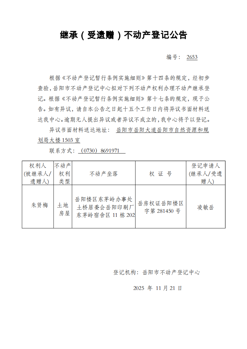 继承(受遗赠)不动产登记公告 编号:凌敏岳(2653)