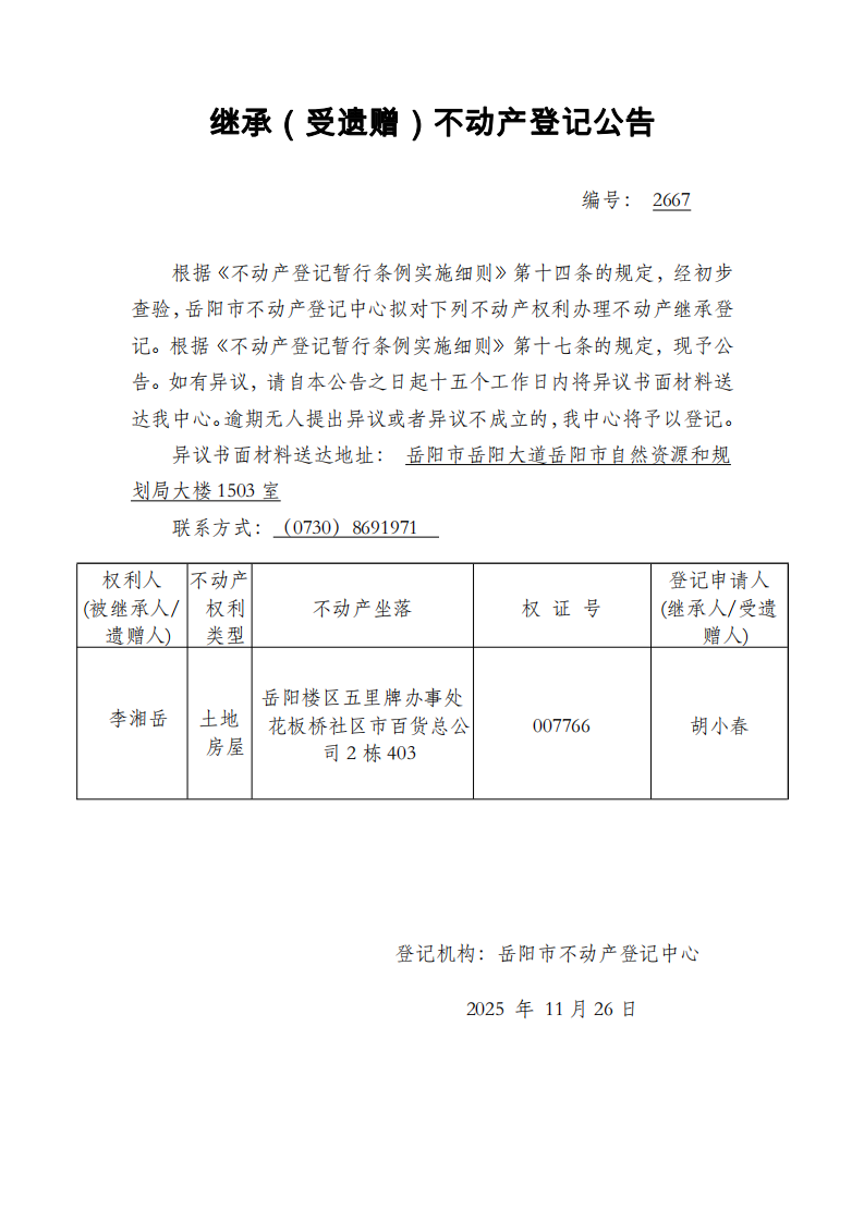 继承(受遗赠)不动产登记公告 编号:胡小春(2667)