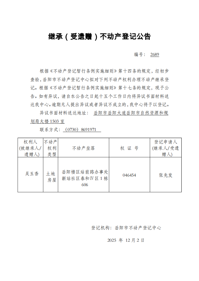 继承(受遗赠)不动产登记公告 编号:张先发(2689)