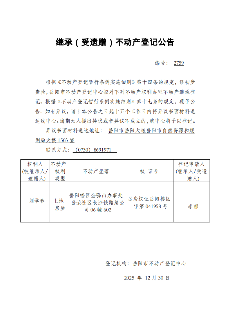 继承(受遗赠)不动产登记公告 编号:李郁(2759)