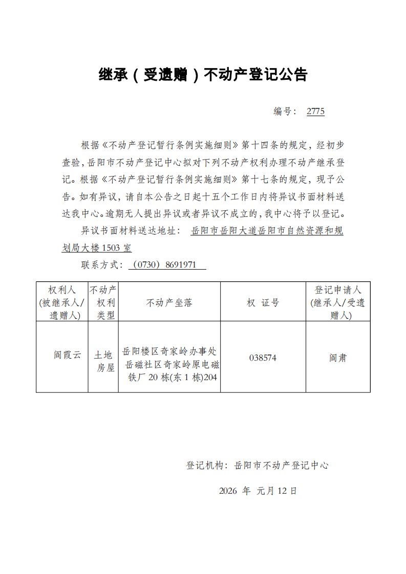 继承(受遗赠)不动产登记公告 编号:阎肃(2775)
