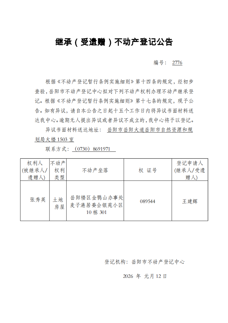 继承(受遗赠)不动产登记公告 编号:王建辉(2776)