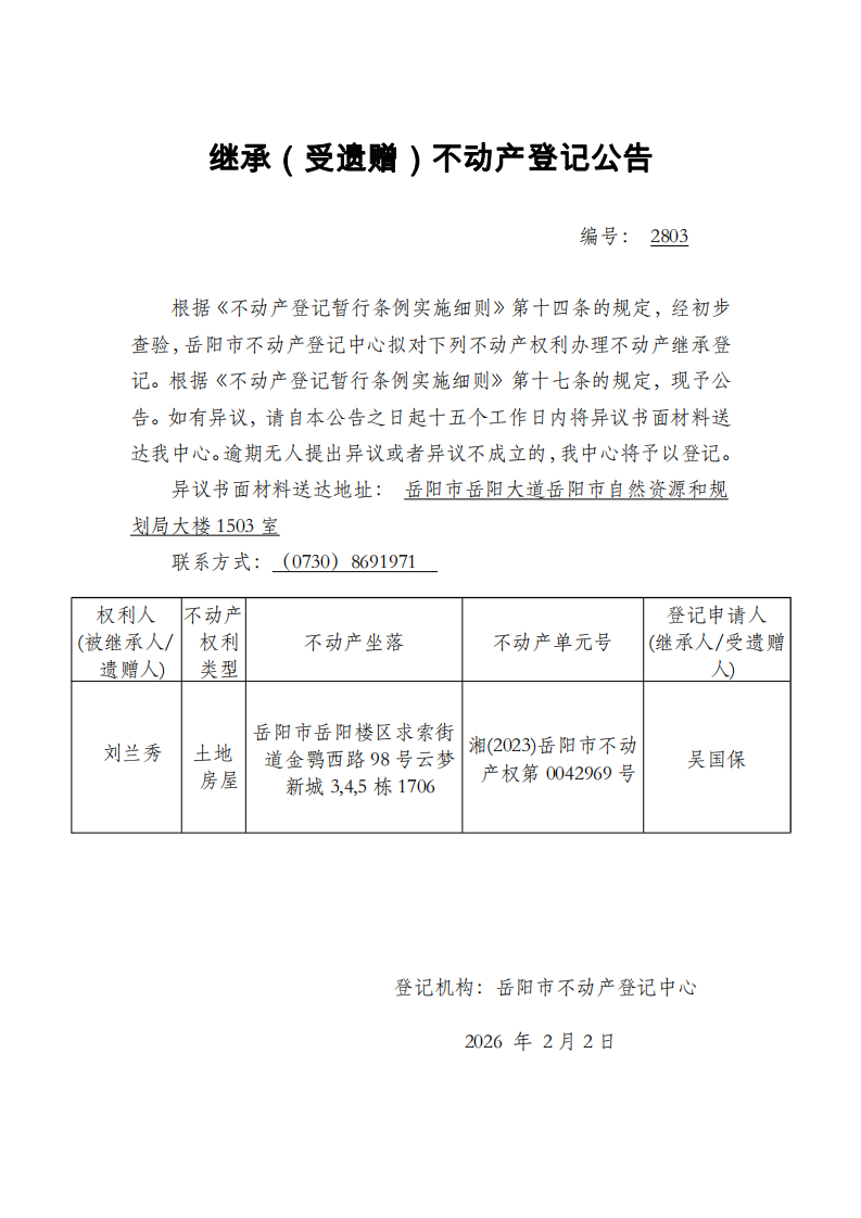 继承(受遗赠)不动产登记公告 编号:吴国保(2803)