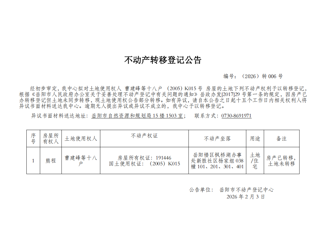 不动产转移登记公告 编号:曹建峰等十八户(2026)转006