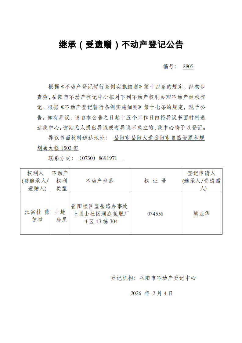 继承(受遗赠)不动产登记公告 编号:熊亚华(2805)