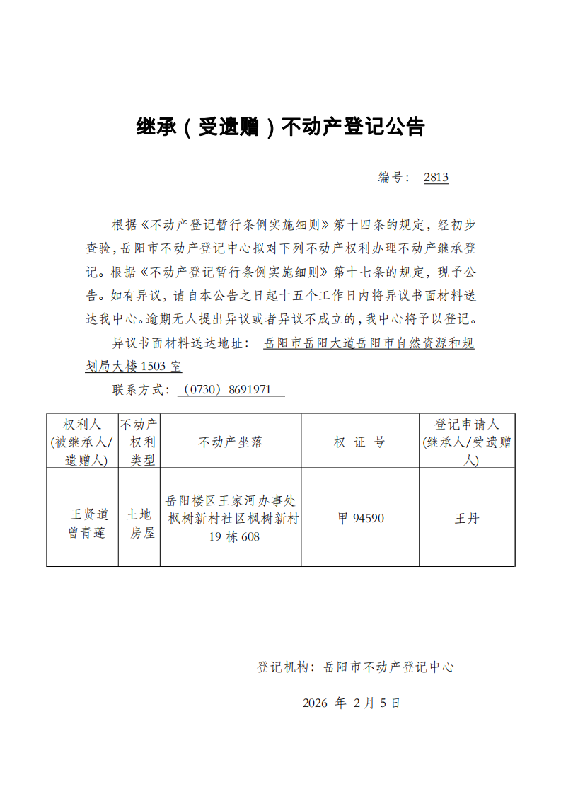 继承(受遗赠)不动产登记公告 编号:王丹(2813)