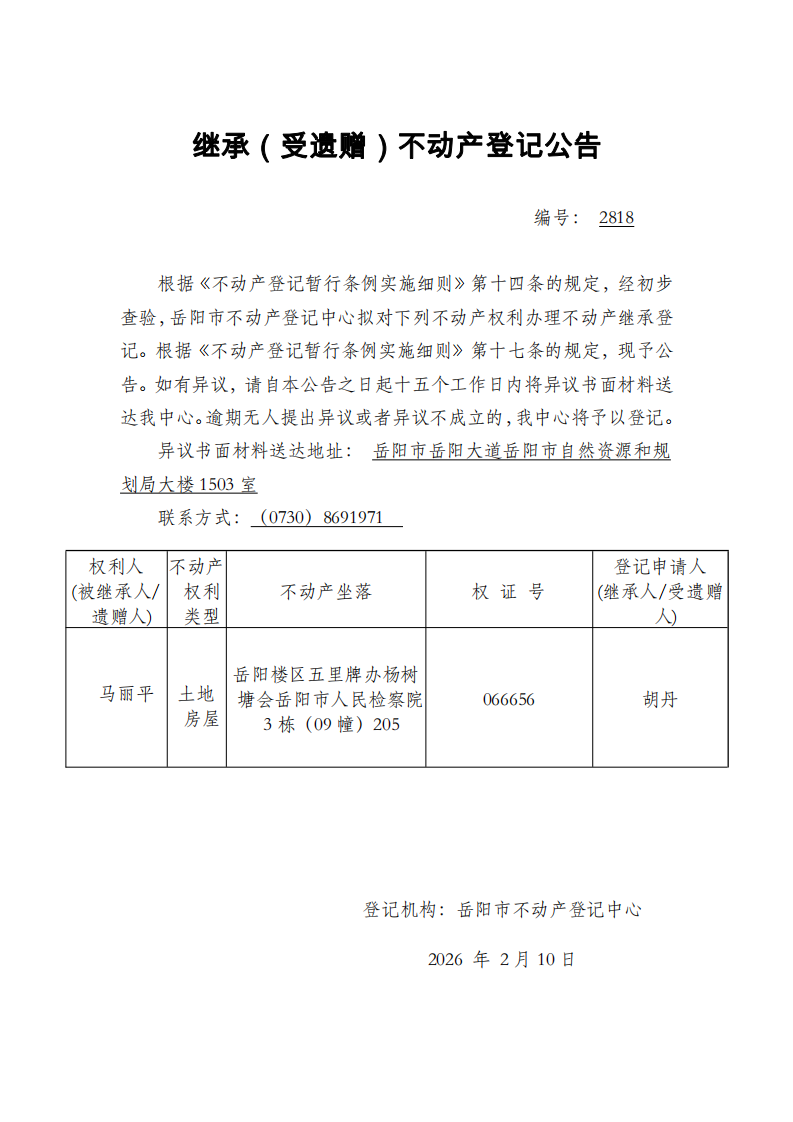 继承(受遗赠)不动产登记公告 编号:胡丹(2818)