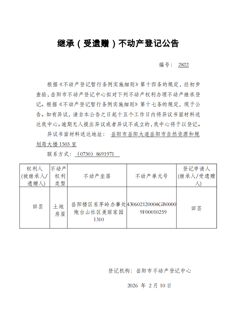 继承(受遗赠)不动产登记公告 编号:田芸(2822)
