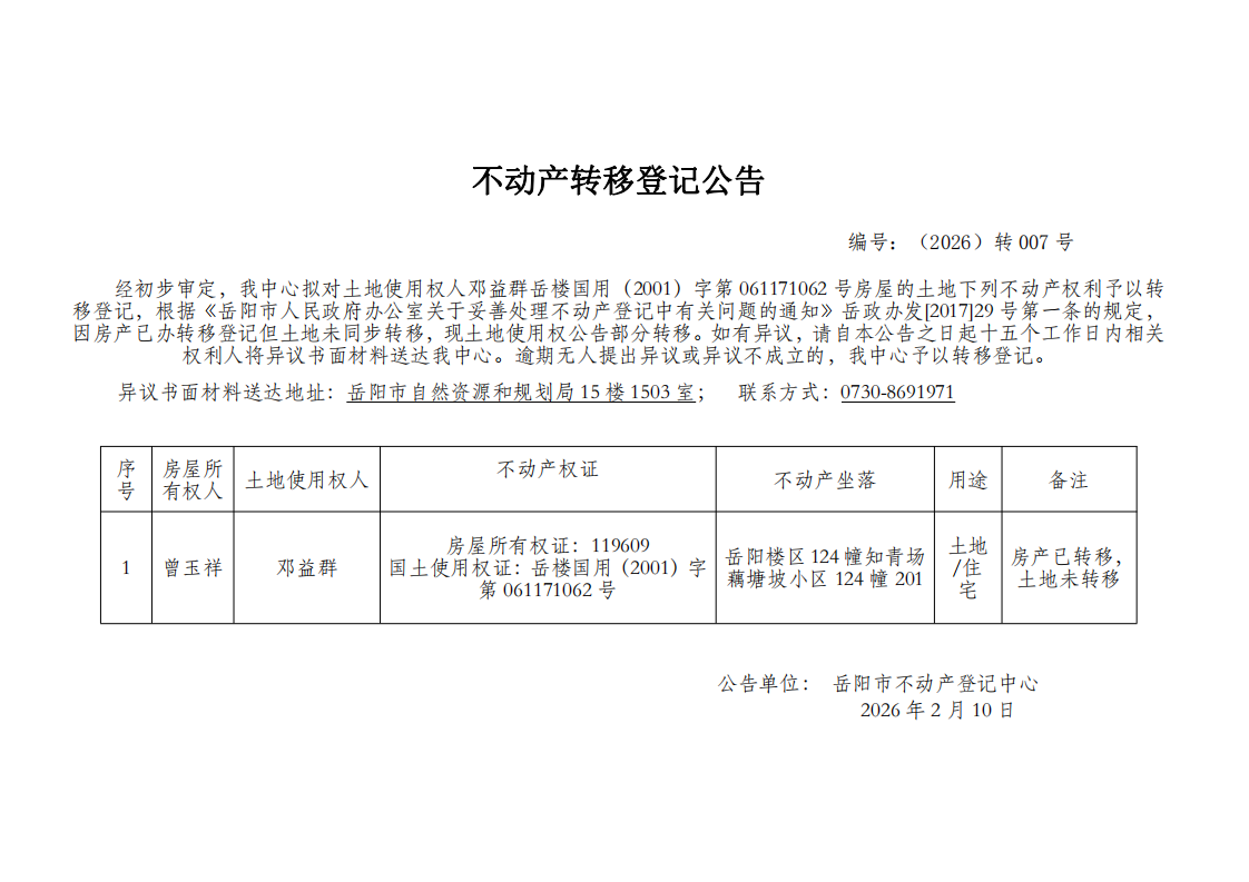 不动产转移登记公告 编号:邓益群(2026)转007