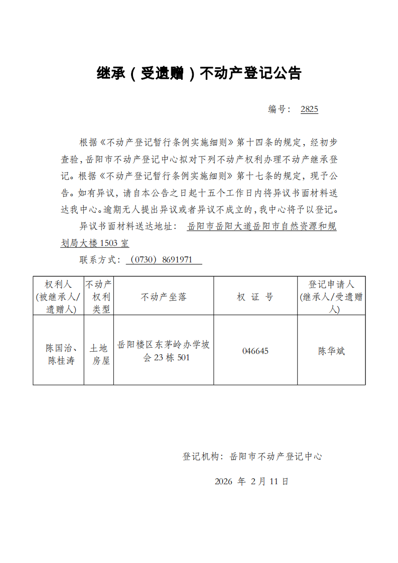 继承(受遗赠)不动产登记公告 编号:陈华斌(2825)