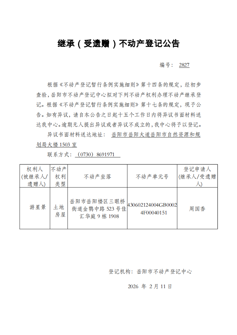 继承(受遗赠)不动产登记公告 编号:周国香(2827)