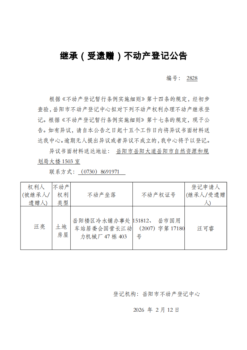 继承(受遗赠)不动产登记公告 编号:汪可睿(2828)