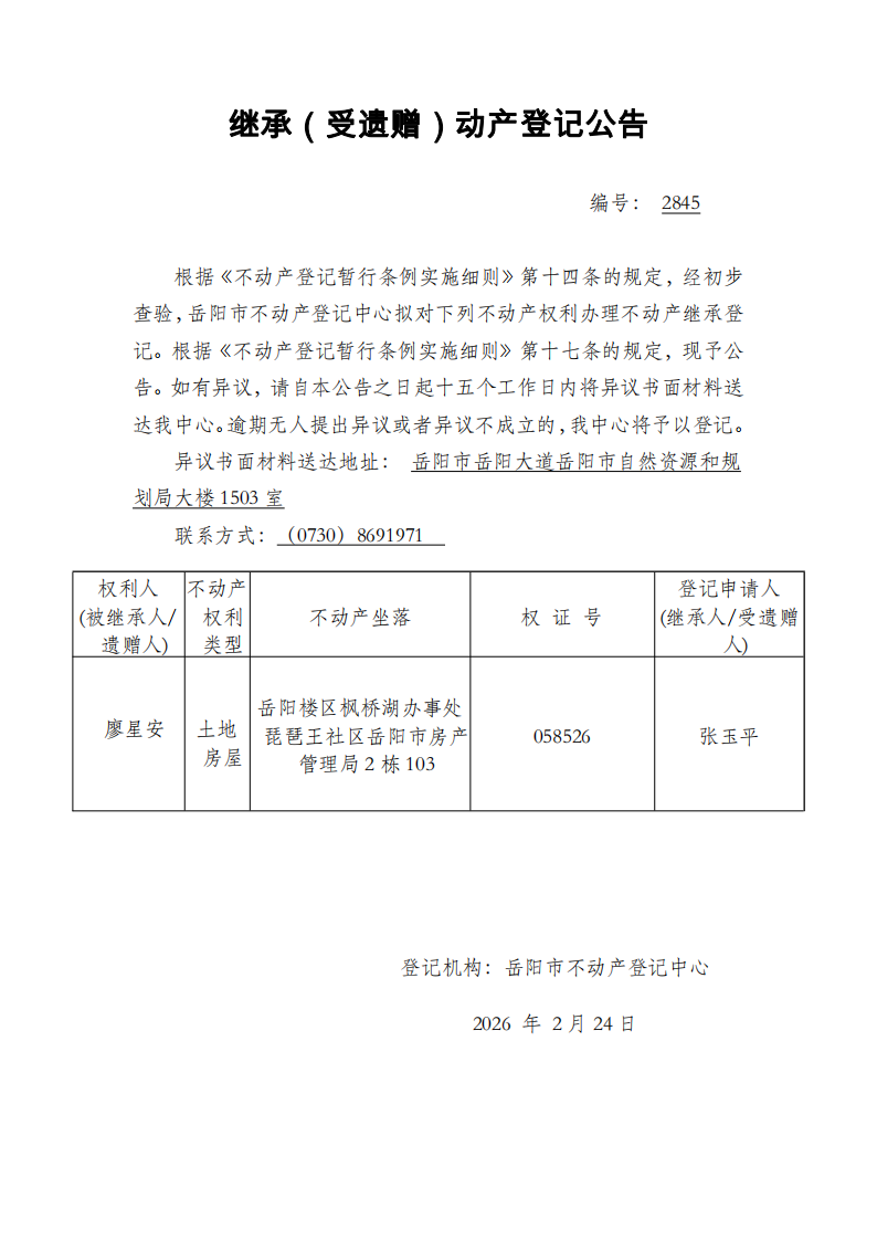 继承(受遗赠)不动产登记公告 编号:张玉平(2845)
