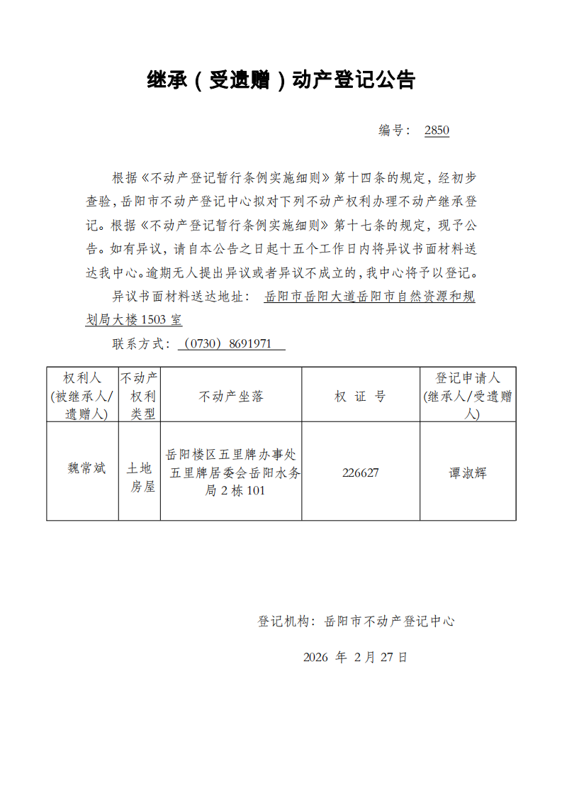 继承(受遗赠)不动产登记公告 编号:谭淑辉(2850)