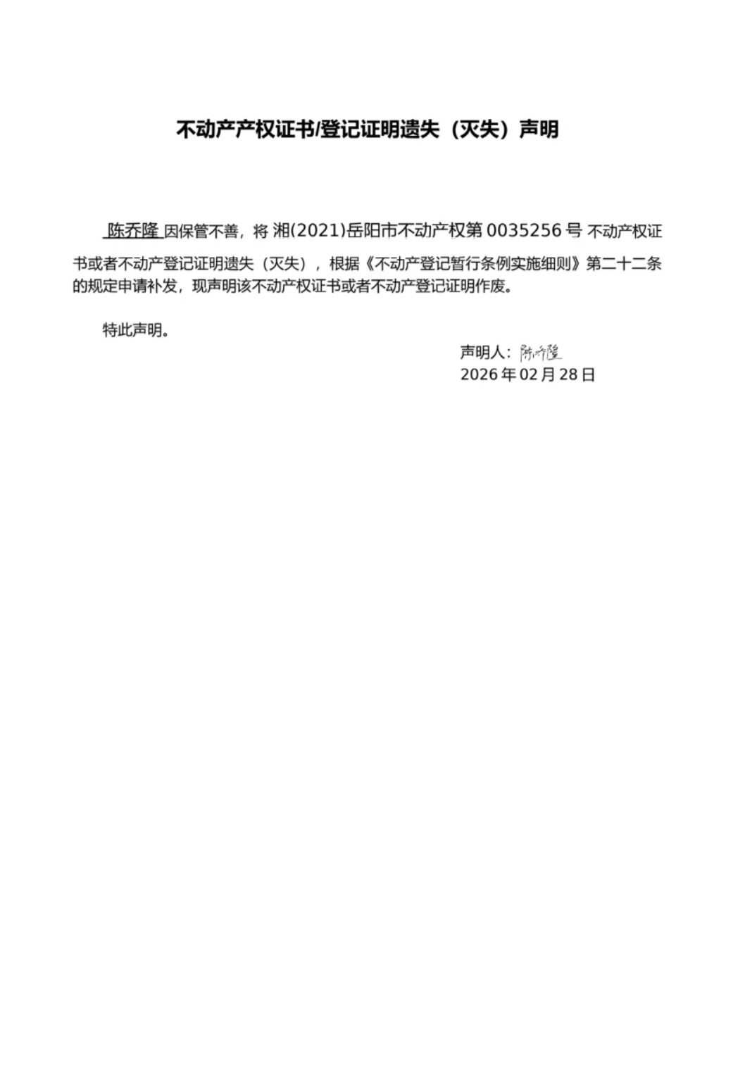 遗失(灭失)声明 (陈乔隆)