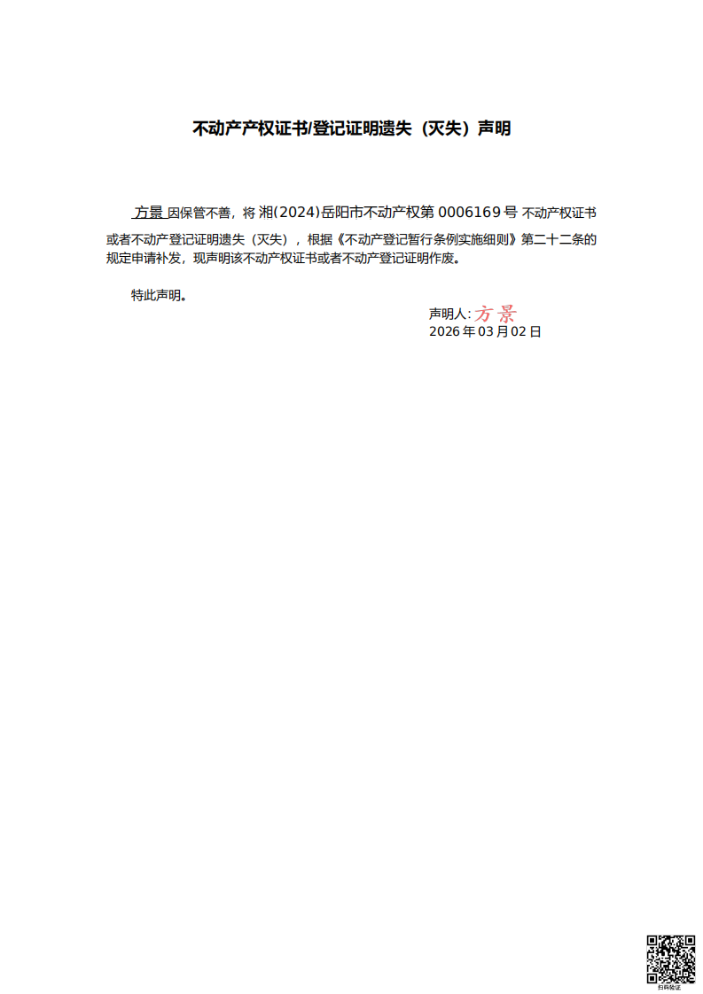 遗失(灭失)声明 (方景)