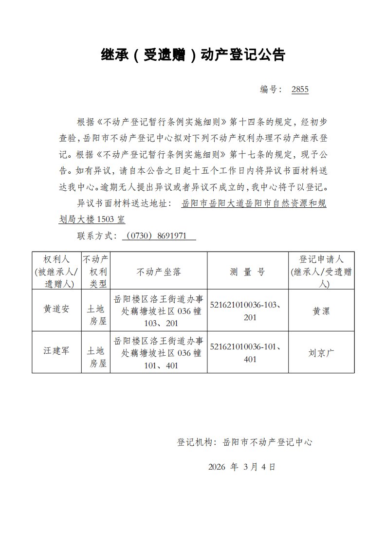 继承(受遗赠)不动产登记公告 编号:黄漯、刘京广(2855)