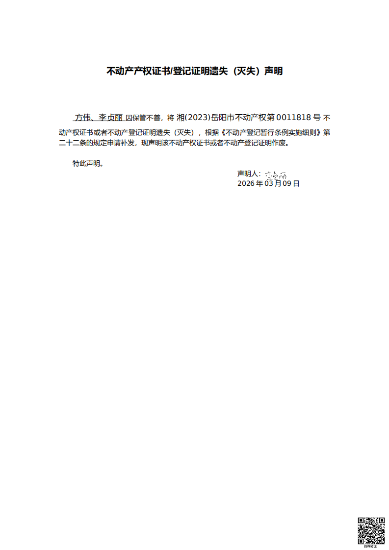 遗失(灭失)声明 (李贞丽)