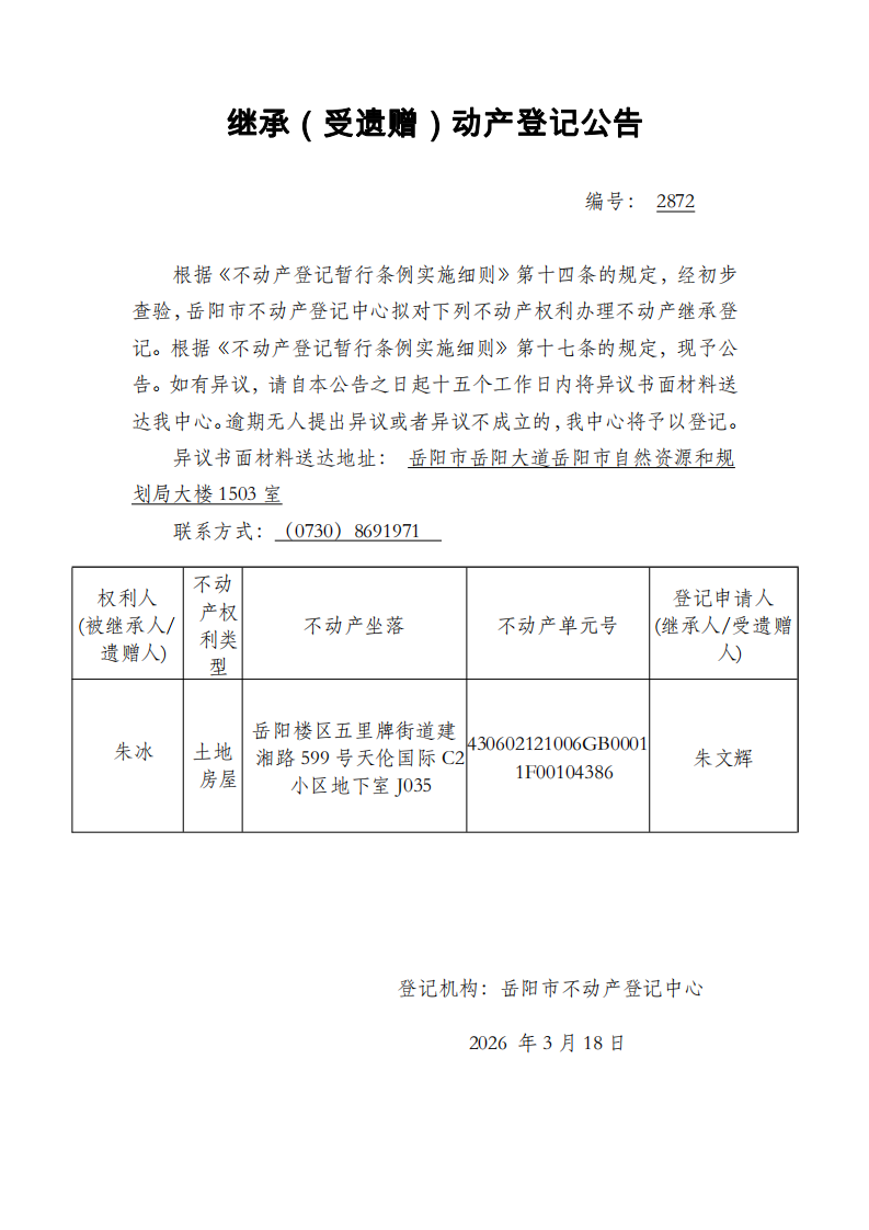 继承(受遗赠)不动产登记公告 编号:朱文辉(2872)