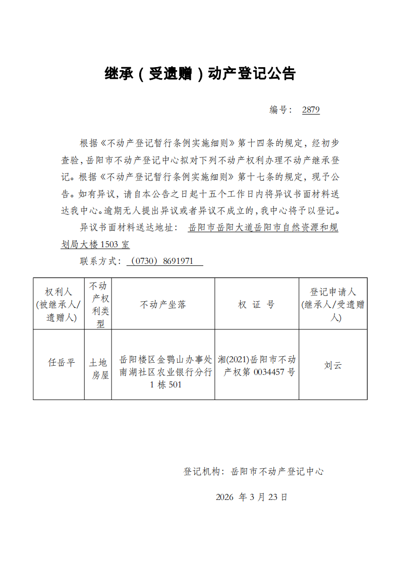 继承(受遗赠)不动产登记公告 编号:刘云(2879)