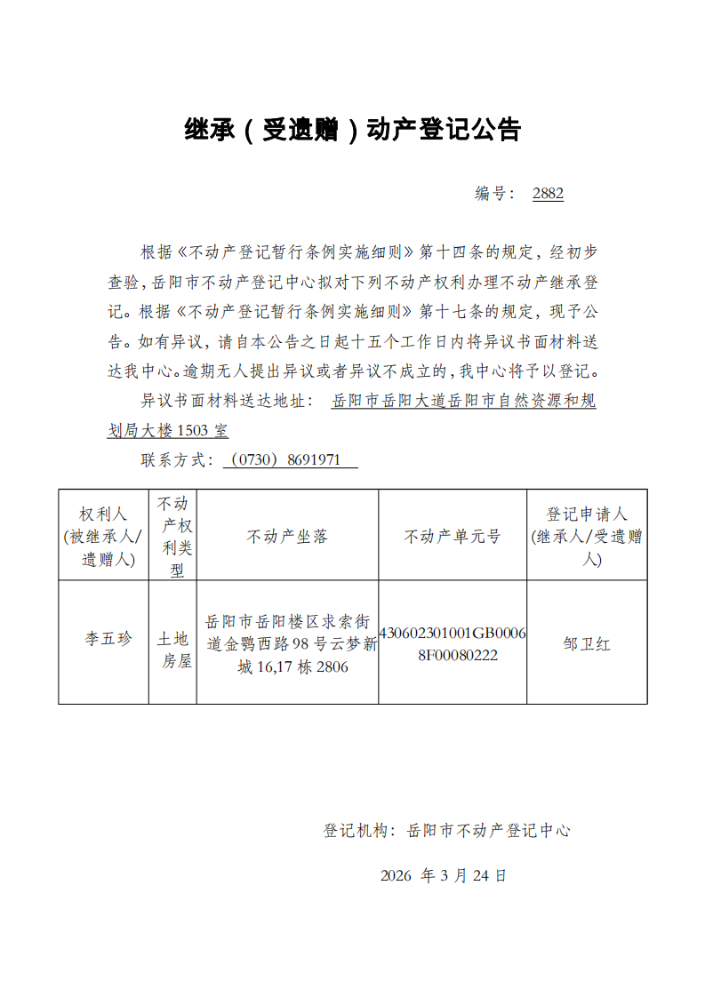 继承(受遗赠)不动产登记公告 编号:邹卫红(2882)