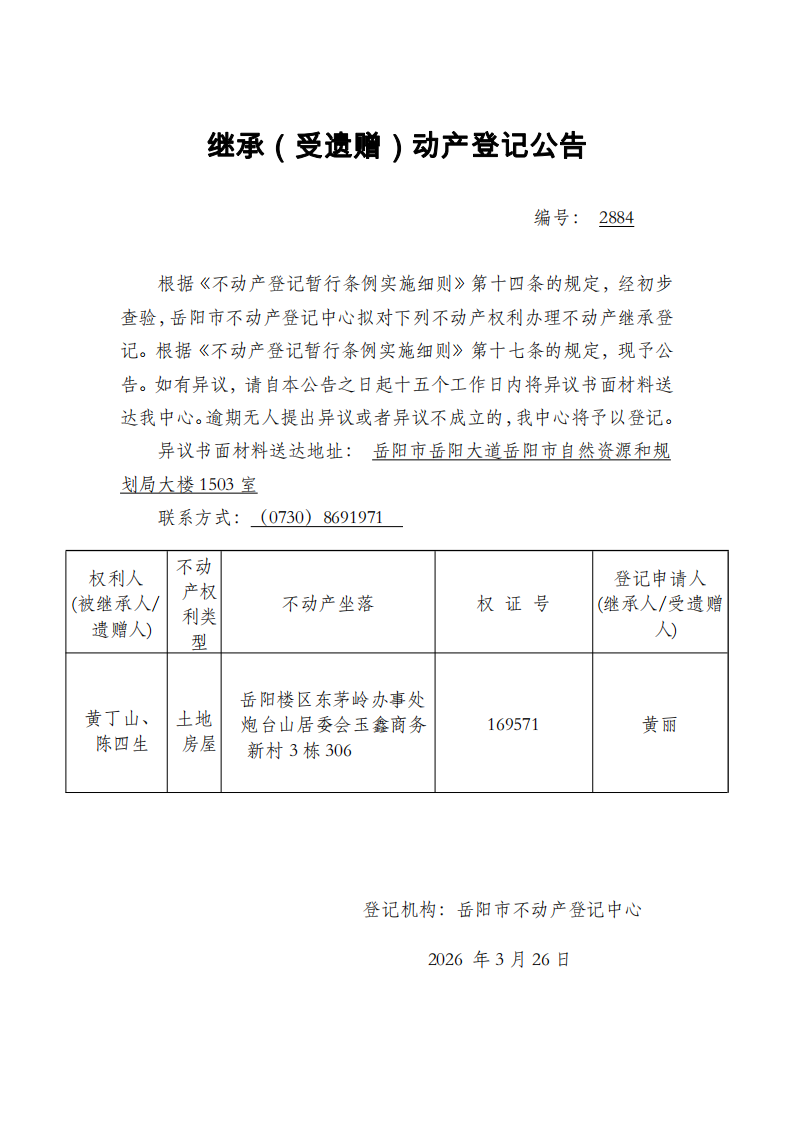 继承(受遗赠)不动产登记公告 编号:黄丽(2884)