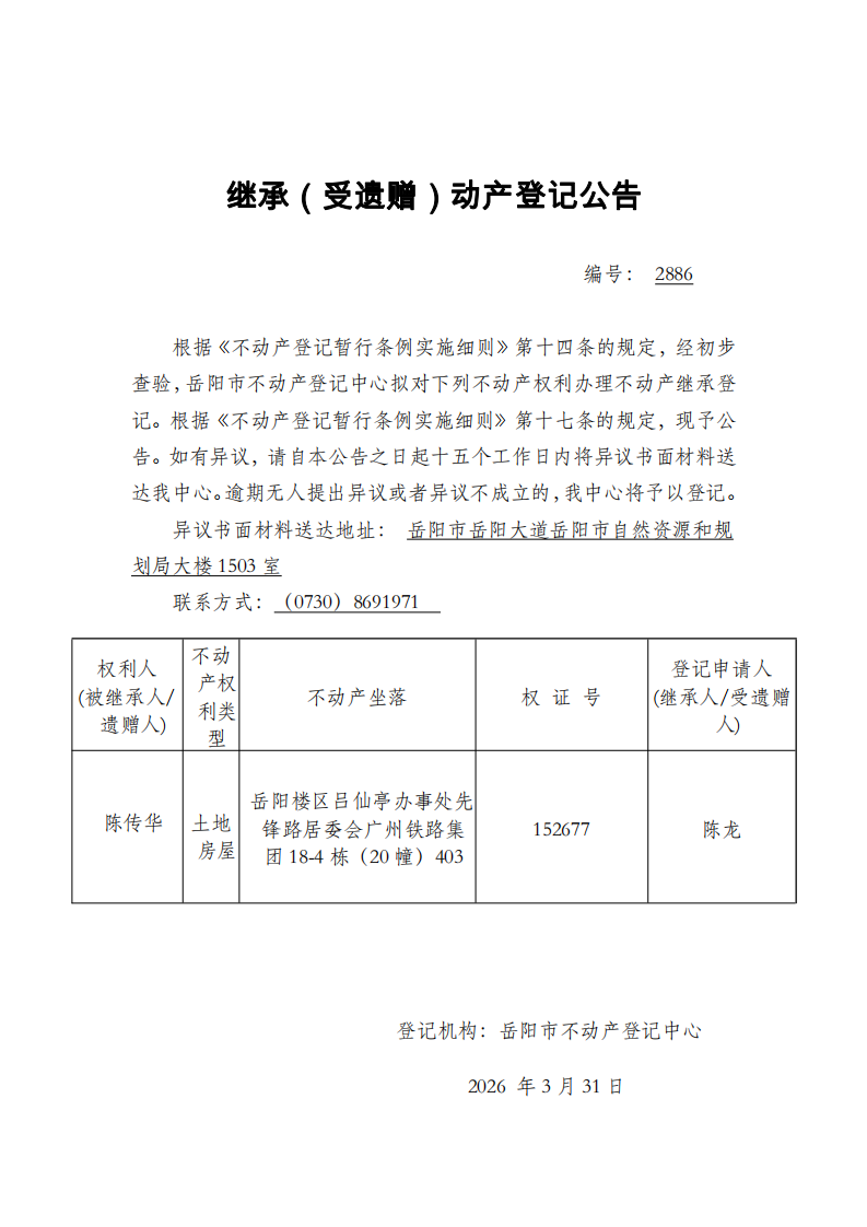 继承(受遗赠)不动产登记公告 编号:喻良秀(2885)