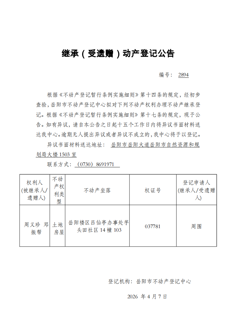 继承(受遗赠)不动产登记公告 编号:周围(2894)