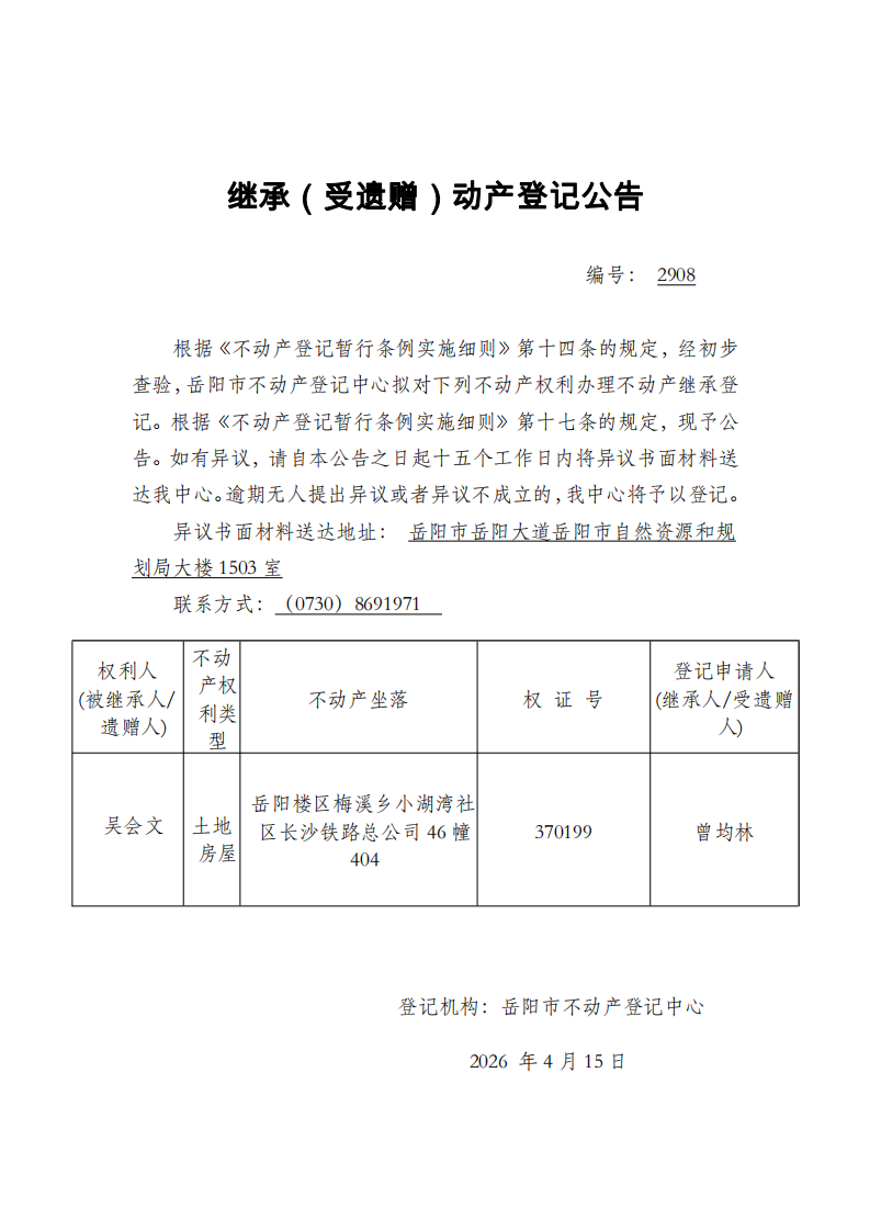 继承(受遗赠)不动产登记公告 编号:曾均林(2908)