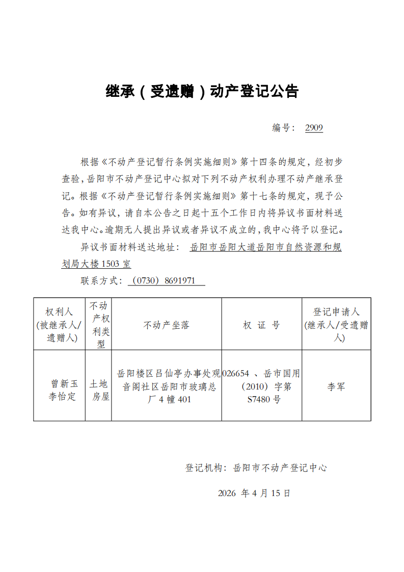 继承(受遗赠)不动产登记公告 编号:李军(2909)