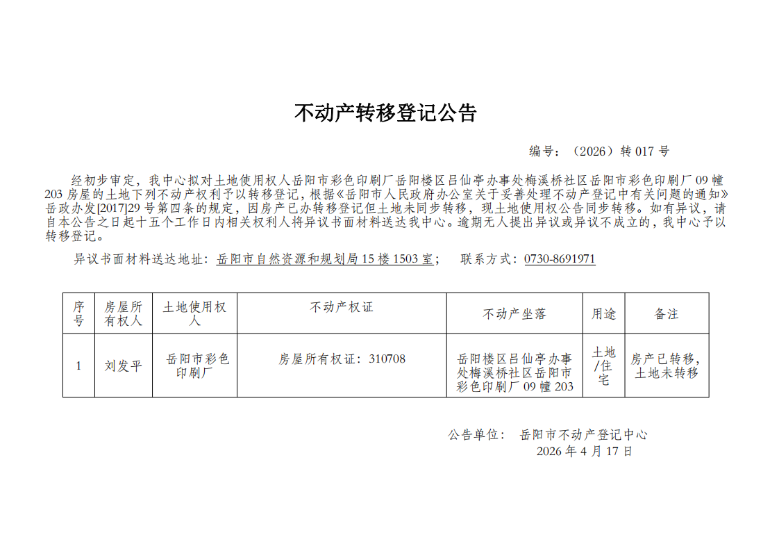 不动产转移登记公告 编号:岳阳市彩色印刷厂(2026)转017号