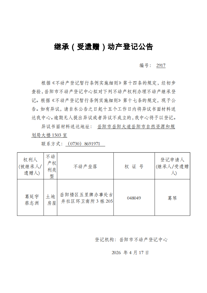 继承(受遗赠)不动产登记公告 编号:葛琴(2917)